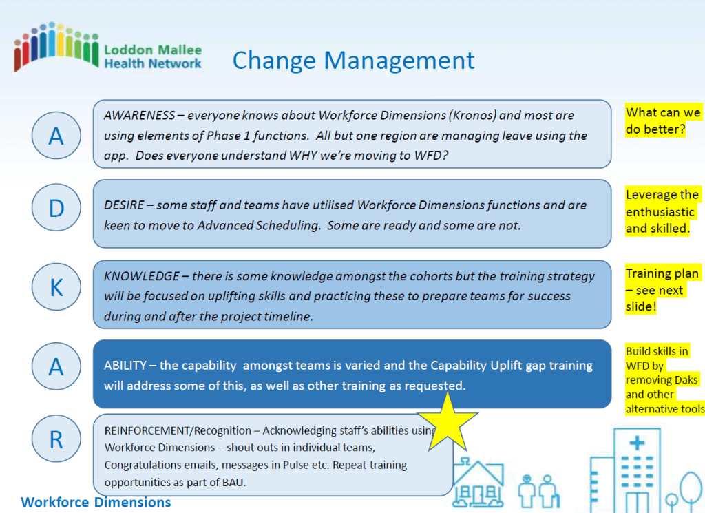 To achieve these outcomes I have adopted learnings from MEDLL to provide frameworks (I have used ADKAR to help punctuate the change elements of the digital transformation with health professionals),